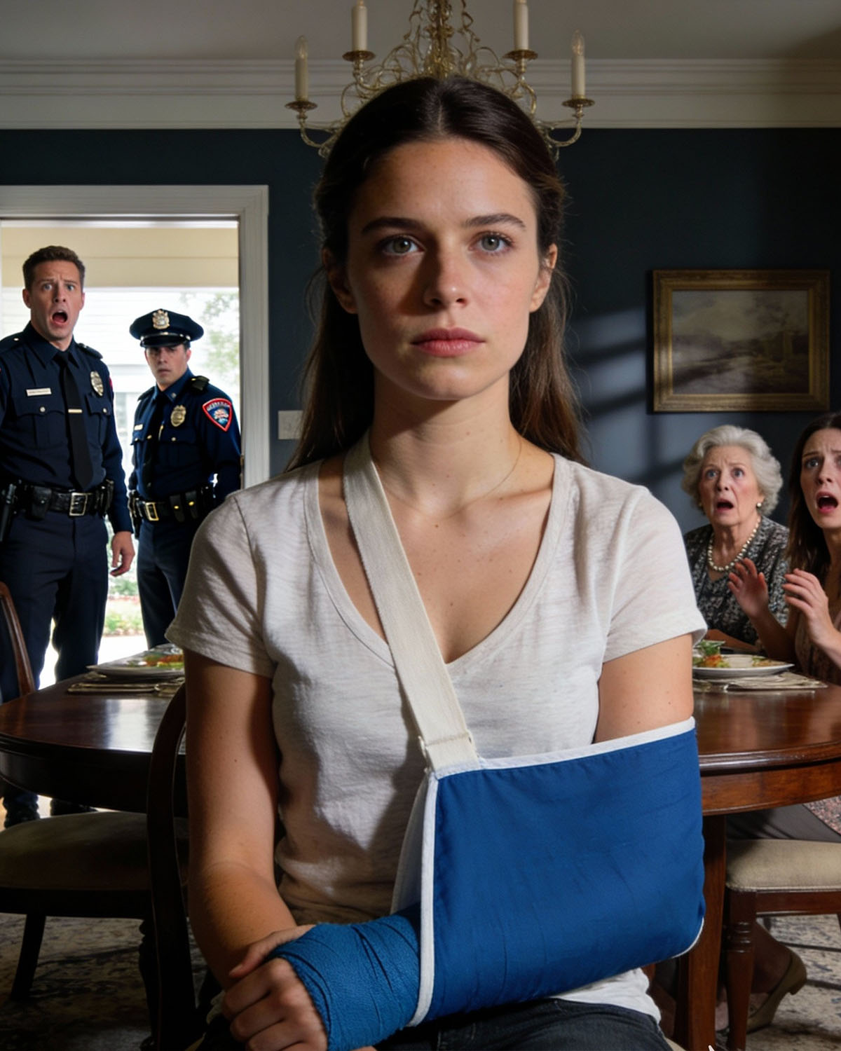 Aquella noche en la cena familiar todo olía a carne asada, vino barato y tensión contenida. Yo, Emily Carter, estaba sentada al extremo de la mesa, con el brazo derecho inmovilizado por un yeso que me llegaba desde la muñeca hasta casi el hombro. Apenas podía sostener el tenedor, y cada movimiento me recordaba el golpe que había recibido hacía dos días. No fue un accidente. Pero todos allí lo trataban como si lo fuera… excepto yo.