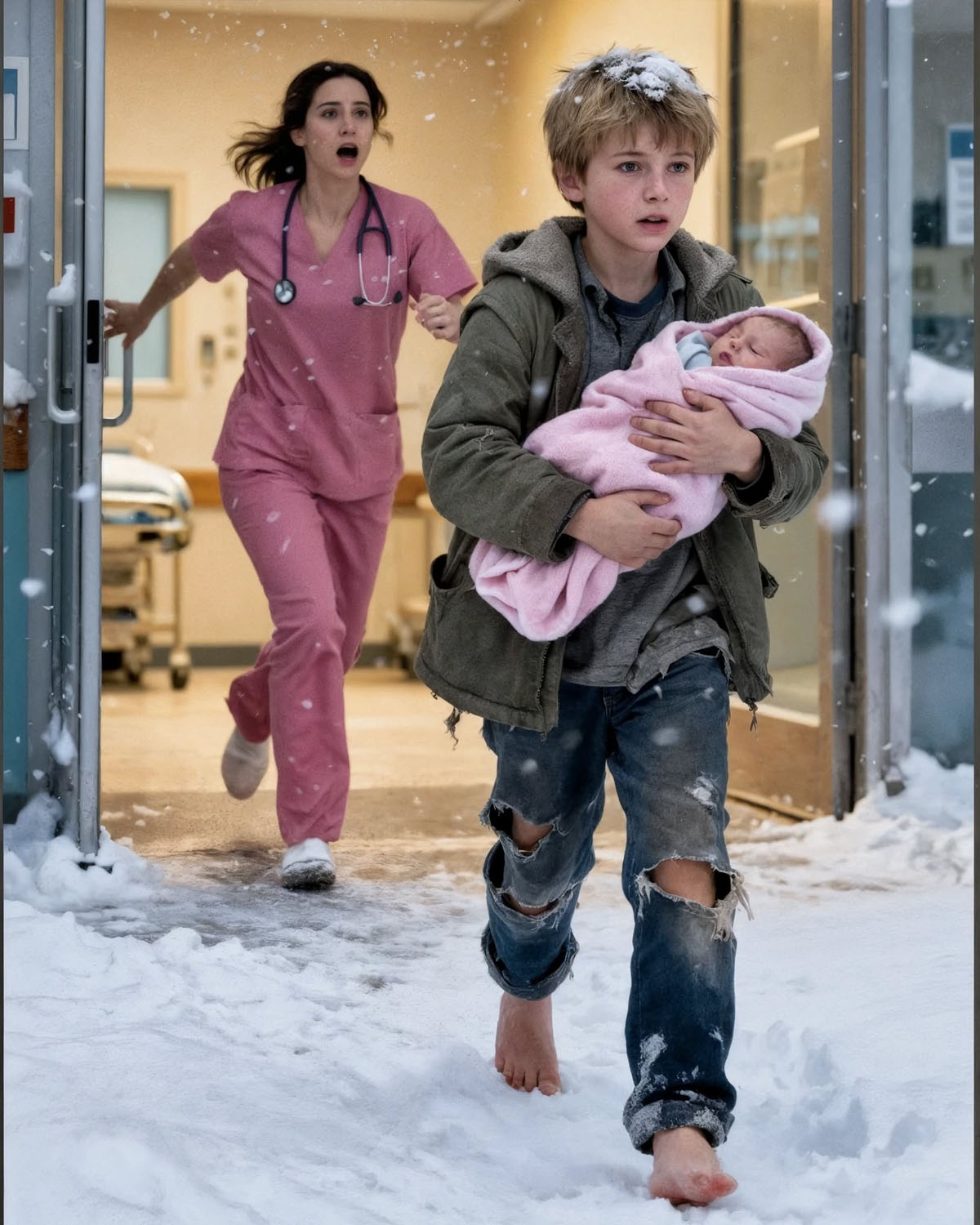 El Dr. Hart intercambió una mirada seria con el guardia antes de llamar a la trabajadora social y avisar a la policía. Fuera, la tormenta de nieve arreciaba, las ráfagas azotando las ventanas. Dentro, Théo seguía sosteniendo a Amélie contra él, sin saber que su valor acababa de desencadenar una cadena de acontecimientos que les salvaría la vida. Una hora más tarde, el inspector Félix Monroe llegó, con el rostro serio bajo la cruda luz de neón. Había visto casos de niños maltratados, pero raramente un niño de siete años cruzando solo las puertas de un hospital, con un bebé en brazos. Théo respondió con calma a las preguntas mientras mecía a Amélie. — ¿Sabes dónde está tu padrastro? —preguntó el inspector. — En casa… estaba bebiendo —respondió él con voz débil pero segura.